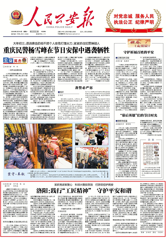 2月26日《人民公安報(bào)》頭版刊登了《洛陽:踐行“工匠精神” 守護(hù)平安和諧》文章,重點(diǎn)展示洛陽市公安局在“大巡防”工作中,如何做到全市城區(qū)侵財(cái)類警情持續(xù)下降。2017年“雙搶”類警情零發(fā)案天數(shù)達(dá)到287天。
