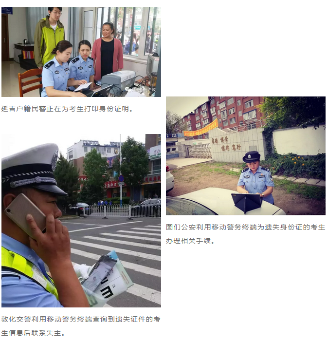 今年高考,延邊全州公安戶政管理部門在8縣(市)11個(gè)高考考場(chǎng)全部設(shè)立了現(xiàn)場(chǎng)服務(wù)點(diǎn),安排了26名戶籍民警利用移動(dòng)警務(wù)終端為考生提供全程實(shí)時(shí)服務(wù)。