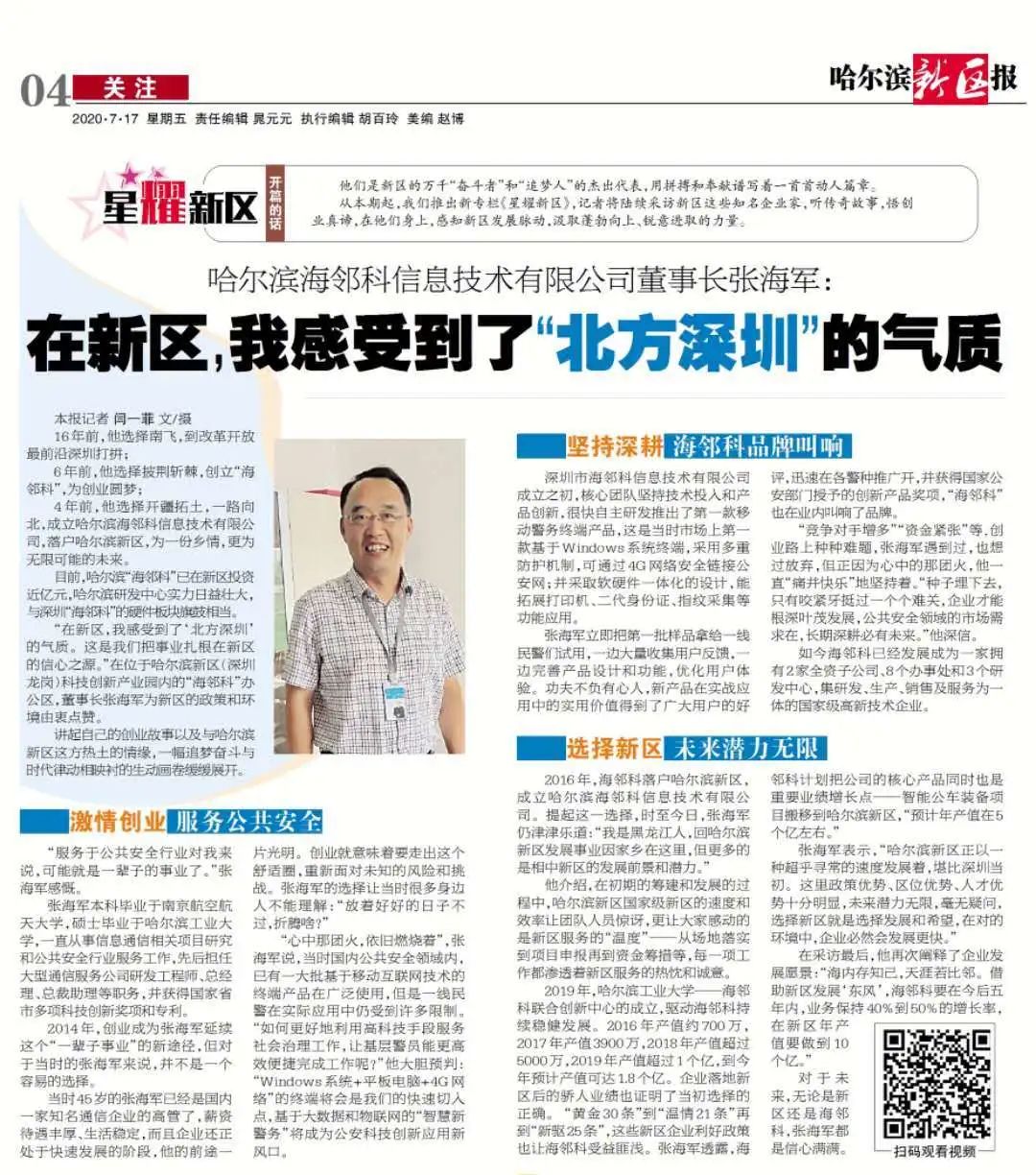海鄰科自2014年創(chuàng)立以來,在集團董事長張海軍的帶領(lǐng)下,在短短6年內(nèi)已快速發(fā)展壯大成一家集研發(fā)、生產(chǎn)、銷售及服務(wù)為一體,在公共安全行業(yè)享有品牌盛譽的國家級高新技術(shù)企業(yè),產(chǎn)品及解決方案在全國27個省市得以廣泛應(yīng)用,獲得了行業(yè)和客戶的高度認可。公司的強勁發(fā)展,吸引了媒體的高度關(guān)注。日前,海鄰科董事長張海軍接受了哈爾濱新區(qū)報的專訪。
