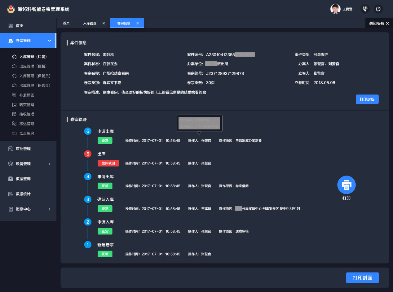 堅(jiān)持讓專業(yè)的人做專業(yè)的事,配備專職管理人員,將偵查人員從事務(wù)性工作中解脫出來(lái),專注于訊問(wèn)辦案。通過(guò)信息化管理手段,實(shí)現(xiàn)卷宗的安全保管、軌跡追溯,切實(shí)保障立卷及時(shí)、保管安全、出入留痕。