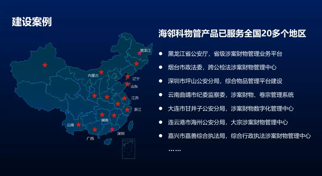 通過物管數(shù)字平臺、智能感知硬件以及場所規(guī)劃為用戶打造一體化涉案財(cái)物管理模式,滿足政法行業(yè)不同場景的建設(shè)需求,目前已服務(wù)公、檢、法、財(cái)、政法委、海關(guān)、紀(jì)委監(jiān)察委等20多個(gè)地區(qū)的政法行業(yè)。